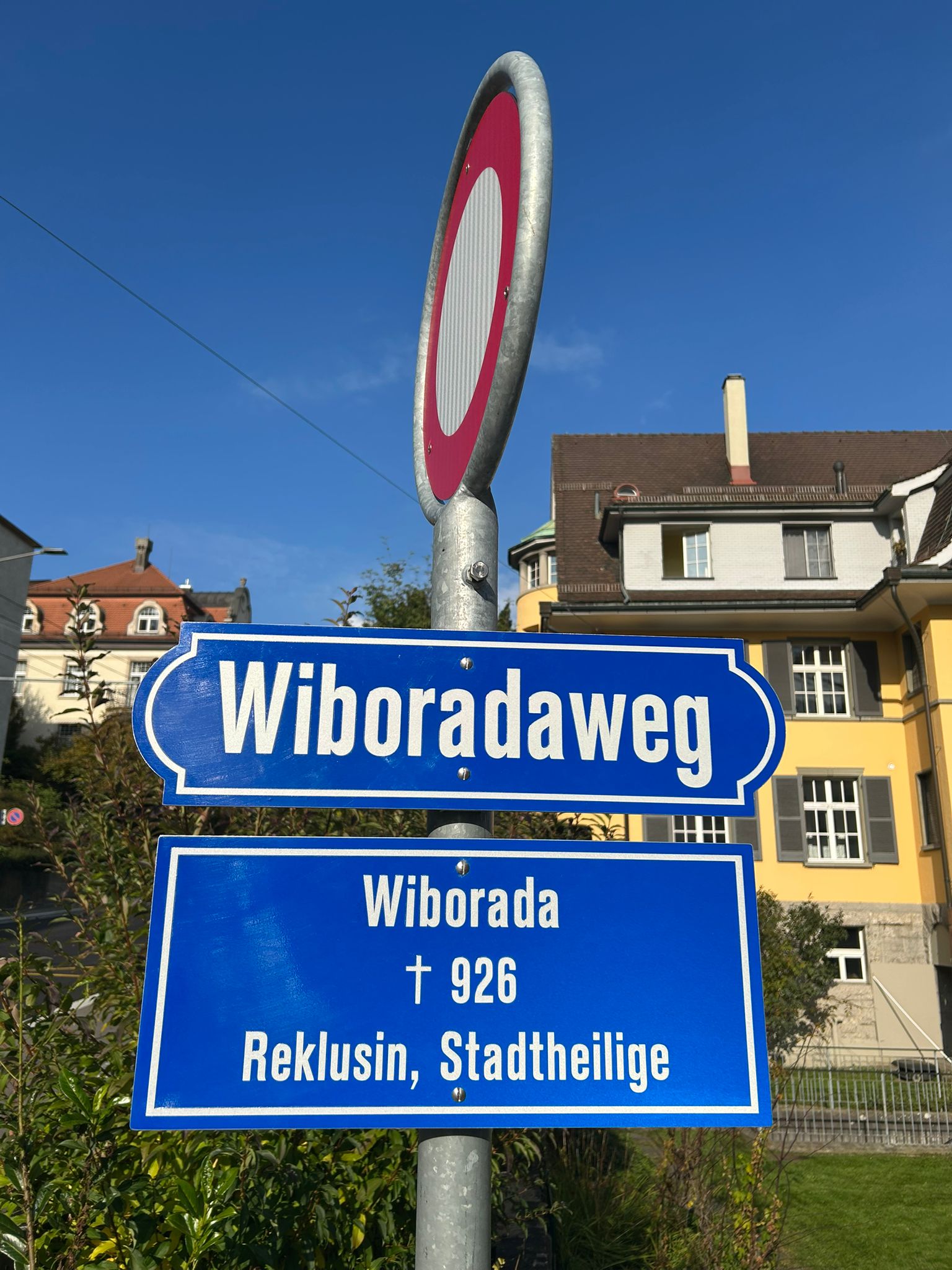 Mit dem Namen «Wiboradaweg» ehrt die Stadt eine besondere St. Galler Persönlichkeit: die heilige Wiborada, die im 10. Jahrhundert lebte und als erste Frau der Schweiz heiliggesprochen wurde. Als Schutzpatronin der Bibliotheken steht sie für Wissen, Bildung und Mut – Eigenschaften, die auch der neue Weg zwischen Tradition und Moderne symbolisch aufgreift.