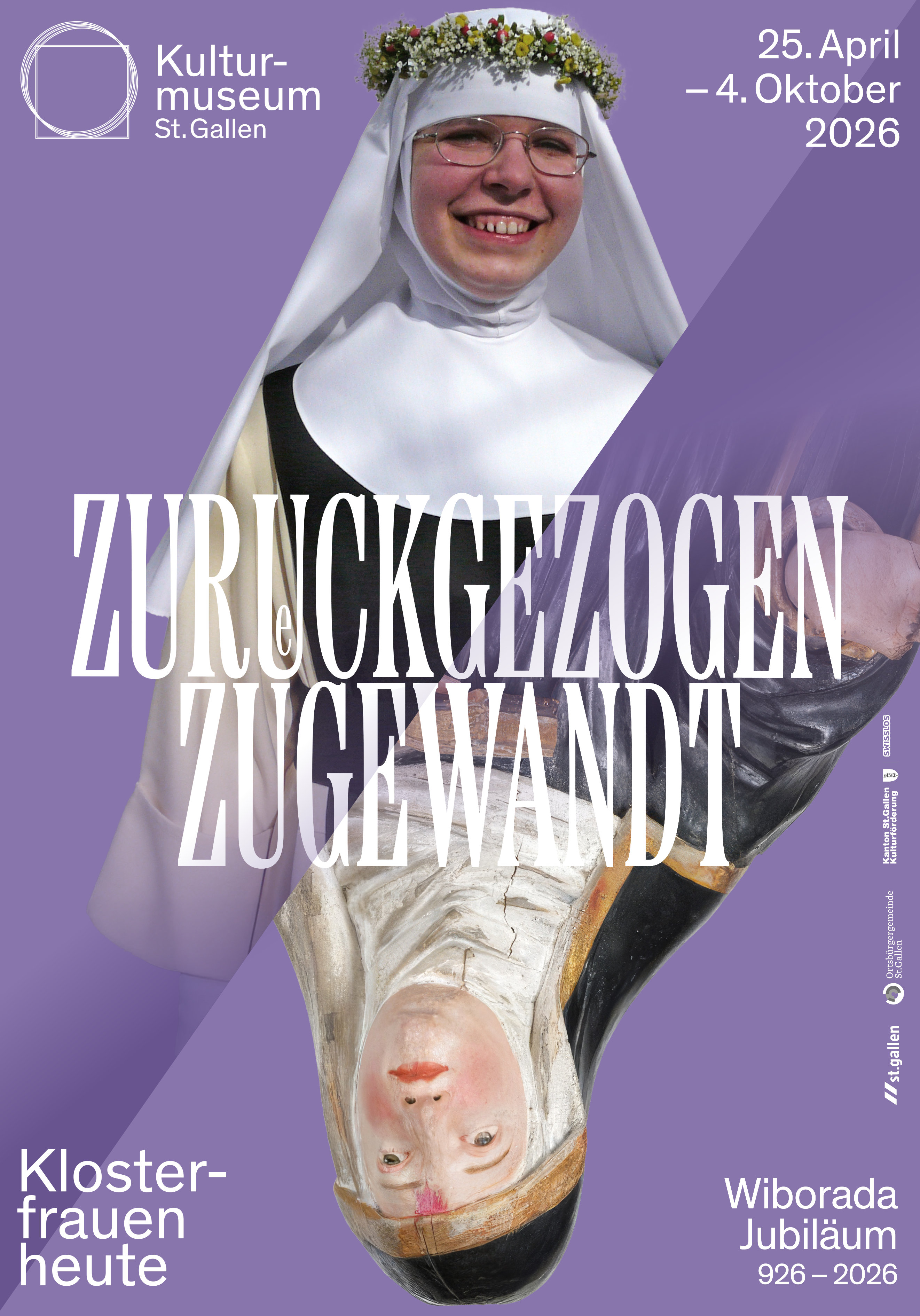 Anlässlich 1100 Jahre Wiborada von St.Gallen widmet sich das Kulturmuseum St.Gallen vom 25. April bis 4. Oktober 2026 ganz besonderen Frauen, die sich für einen spirituellen Lebensweg entschieden haben. Sie erzählen vom Leben im Kloster, ihrem Wirken als Eremitin oder von ihren Erfahrungen als mobile Inklusin.
