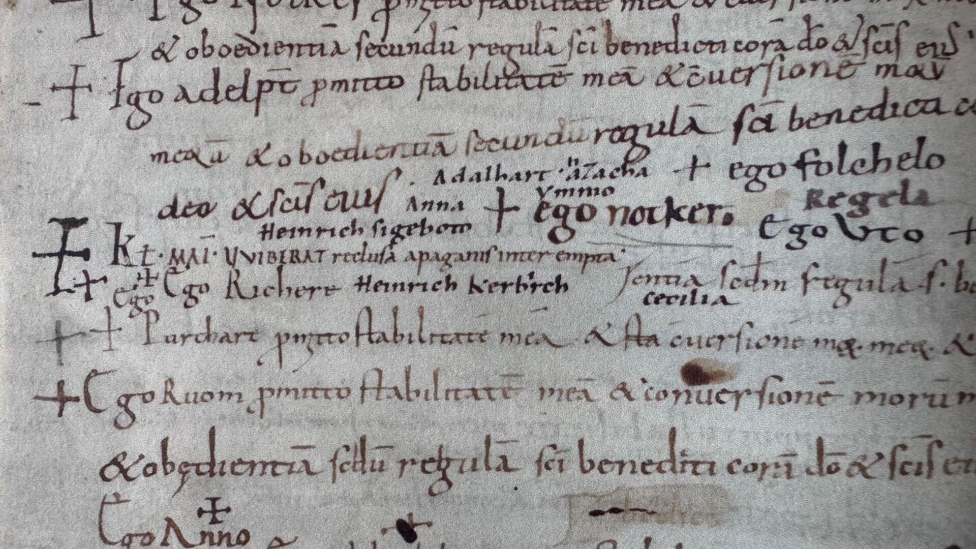 Es ist «eher ausgeschlossen», dass ein Mönch ihr diesen Platz zuwies oder für sie unterschrieb. «Dieser hätte kaum eine solche Leerstelle gesucht, sondern eher den Schluss der Liste». Damit hat das Stiftsarchiv St.Gallen die – vermutlich einzige – autographe Spur Wiboradas entdeckt und zeigt Wiboradas Unterschrift nun im Original im Rahmen der Ausstellung «Vviberat & Rachilt» vom 27. Februar bis 28. Mai 2026.Wie «Vviberat» zu «Wiborada» wurde